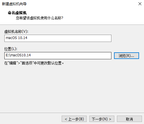 虚拟机名称输入【macOS 10.14】,点击【浏览】更改系统的安装位置建议安装在除C盘以外的磁盘,可在F盘或其他磁盘新建个【macOS10.14】文件夹,点击【下一步】
