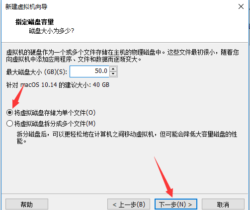 最大磁盘大小设置成50GB,选择【将虚拟磁盘储存为单个文件】,然后点击【下一步】