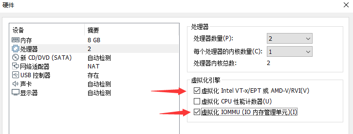 点击【处理器】,勾选【虚拟化Intel VT -x/EPT】和【虚拟化IOMMU】