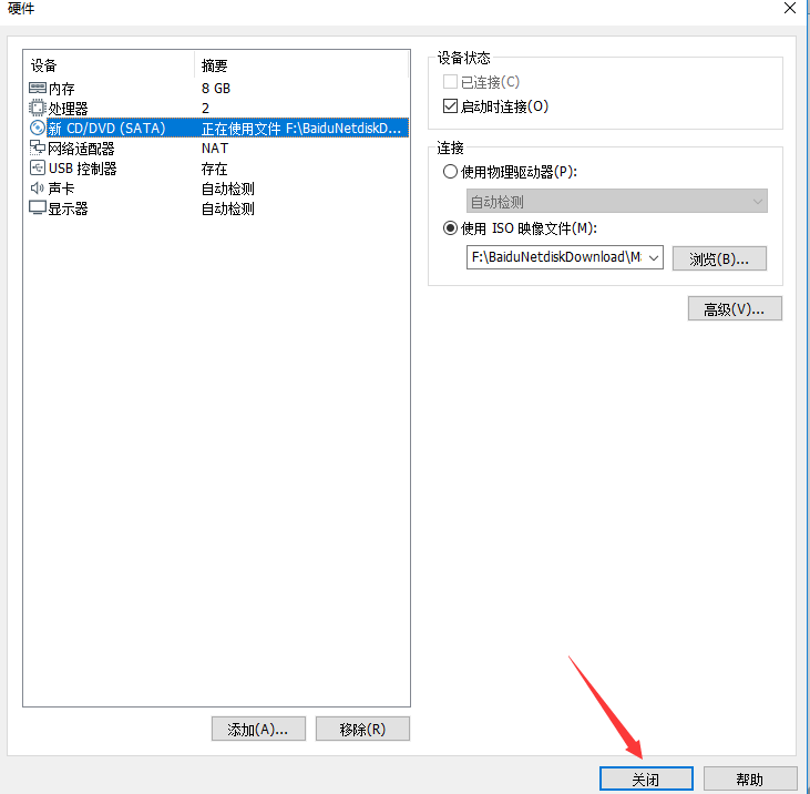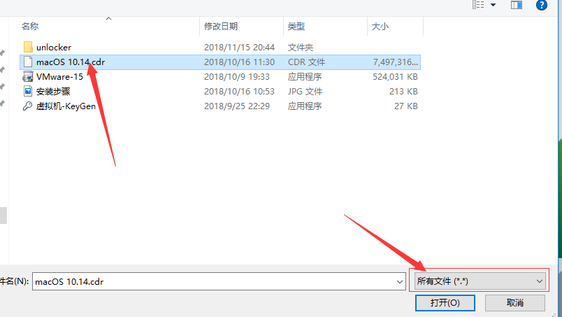 选择【新CD/DVD(SATA)】后选择【使用ISO镜像文件】,点击【浏览】,文件类型选择【所有文件】,找到之前解压后的【MacOS10.14】文件夹,选中【macOS 10.14】文件然后点击【打开】