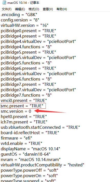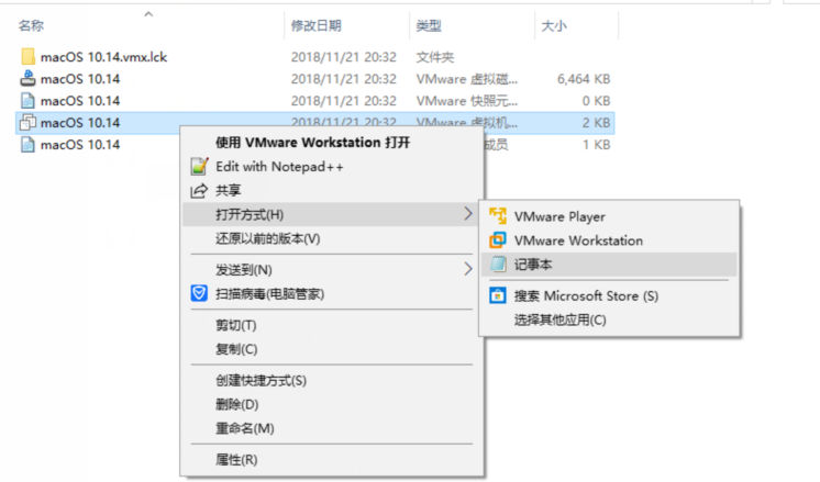 找到之前设置的虚拟机位置【F:\macOS 10.14】中的【macOS 10.14.vmx】文件鼠标右击选择【打开方式】并选择记事本打开