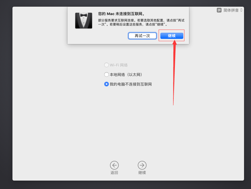 选择【我的电脑不连接到互联网】然后点击【继续】