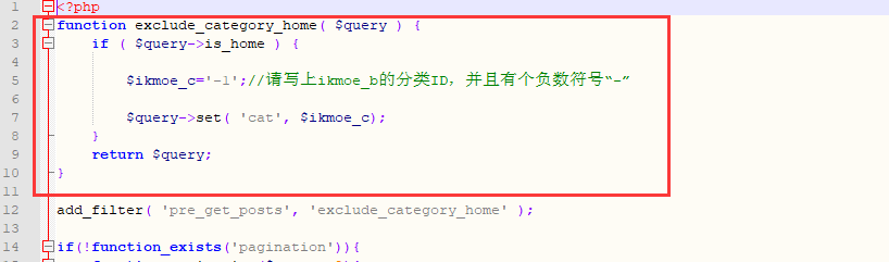步骤三:打开ikmoe-functions.php,对这里进行设置,写上相册分类ID,为的防止图片文章出现在首页。请带负号 -