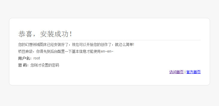 你需要将幻想领域的源代码解压缩并上传至网站根目录,访问网站域名会自动跳转到安装程序,根据向导提示安装即可。如果未跳转,请手动访问http://您的域名/install.php 进行安装