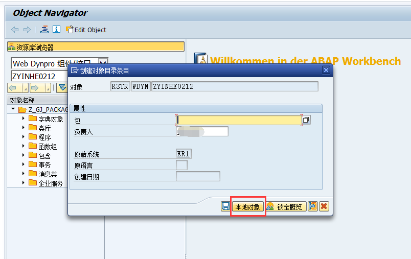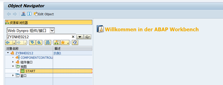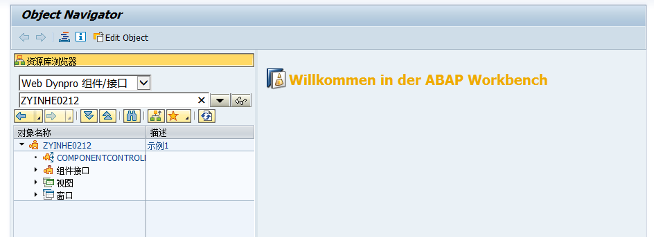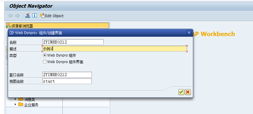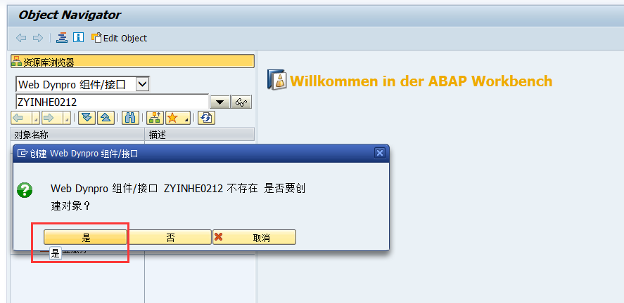 进入事务码SE80,在左侧对象框列表中选择“Web Dynpro组件/接口”,输入对象的名称“ZYINHE0212”,然后回车,系统将询问是否创建此对象,单击“是”。