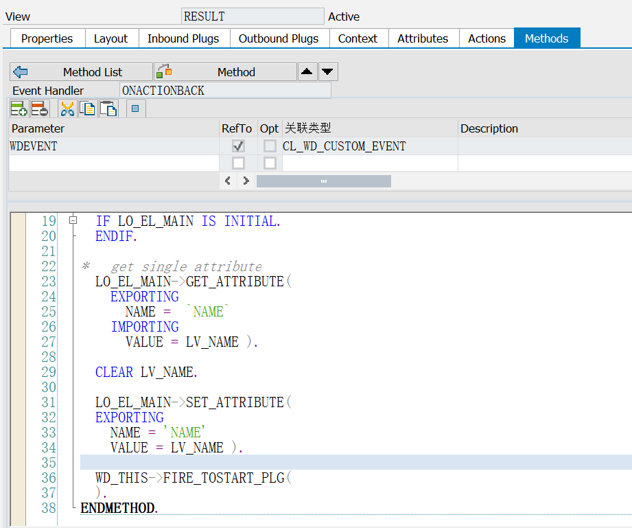来到RESULT视图,单击Methods选项卡,找到“WDDOMODIFYVIEW”方法,双击进入。在代码中键入空行,然后在上方工具栏选择“Web Dynpro Code Wizard”按钮(快捷键Ctrl+F7)。