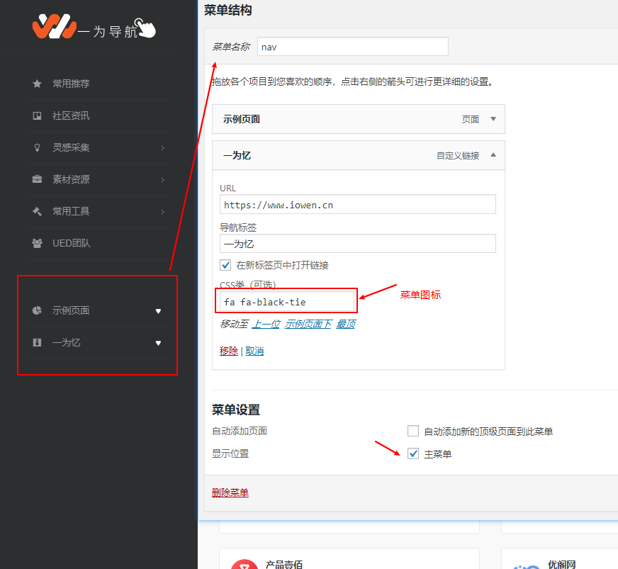 - 导航菜单栏下方可以添加自定义菜单,在后台的外观-->菜单里设置,在菜单的css类添加图标(参考下图),图标样式请参考fontawesome