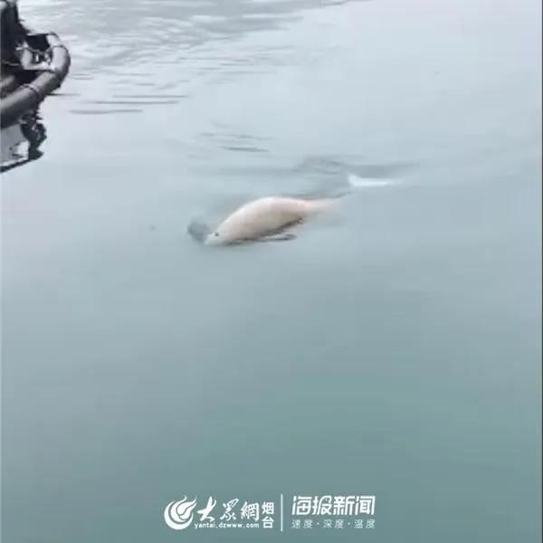渔民发现了一只野生白江豚在海面上嬉戏,