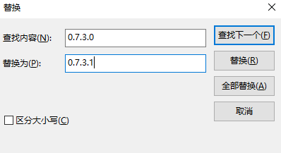简单快速的替换方式教程:点击编辑,选择替换,输入查找内容:0.7.3.0替换为输入:0.7.3.1点击全部替换。然后保存
