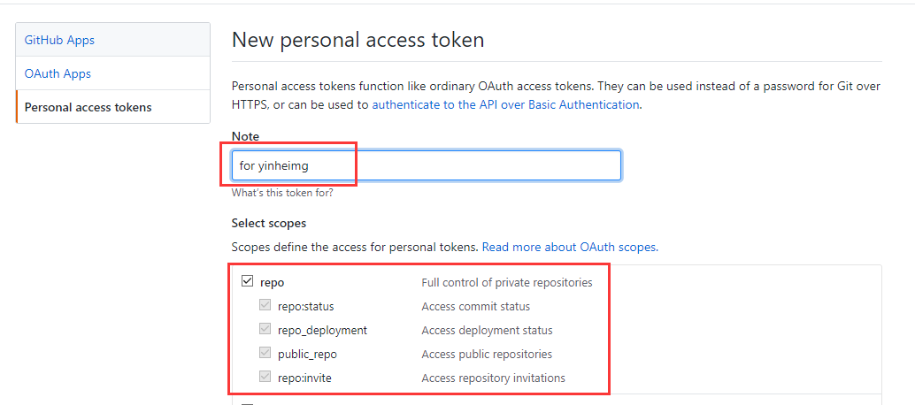 - 创建一个token,写上注释,repo打勾,页面拉到后面,