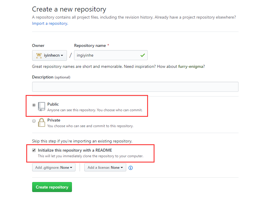 iyinhecn/ingingyinhe就是github用户名和仓库名,以后要用到。