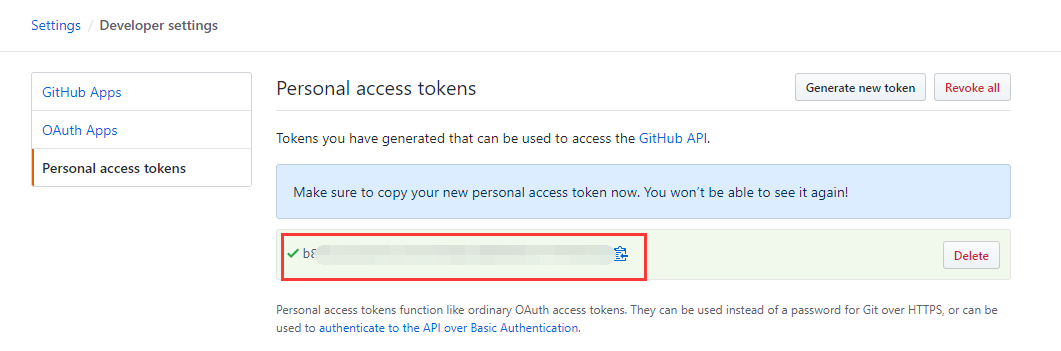 - 复制这里的Token,注意这个Token只会显示一次,先保存到安全的地方,如果忘记只能重置。