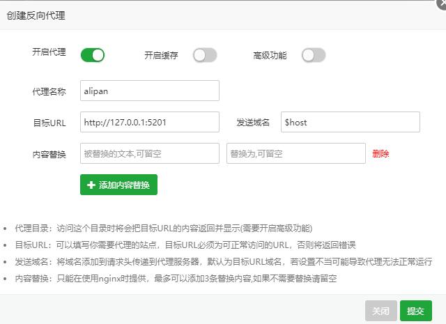再次进入第二步添加的站点设置页,添加反向代理 代理就是就是上图看到的服务运行地址,在我这里就是 http://127.0.0.1:5201