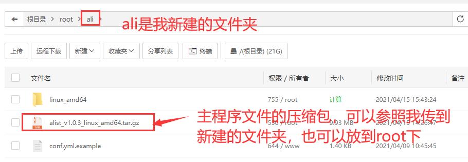 - 前往AList Release下载对应系统的程序,在宝塔中上传到root目录下解压得到一个示例配置文件和一个系统名称文件夹里面包含运行文件