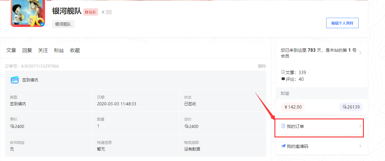 - 文章打赏、商城订单、积分抽奖、积分兑换、认证费用、签到填坑都会在“我的订单”页面显示
